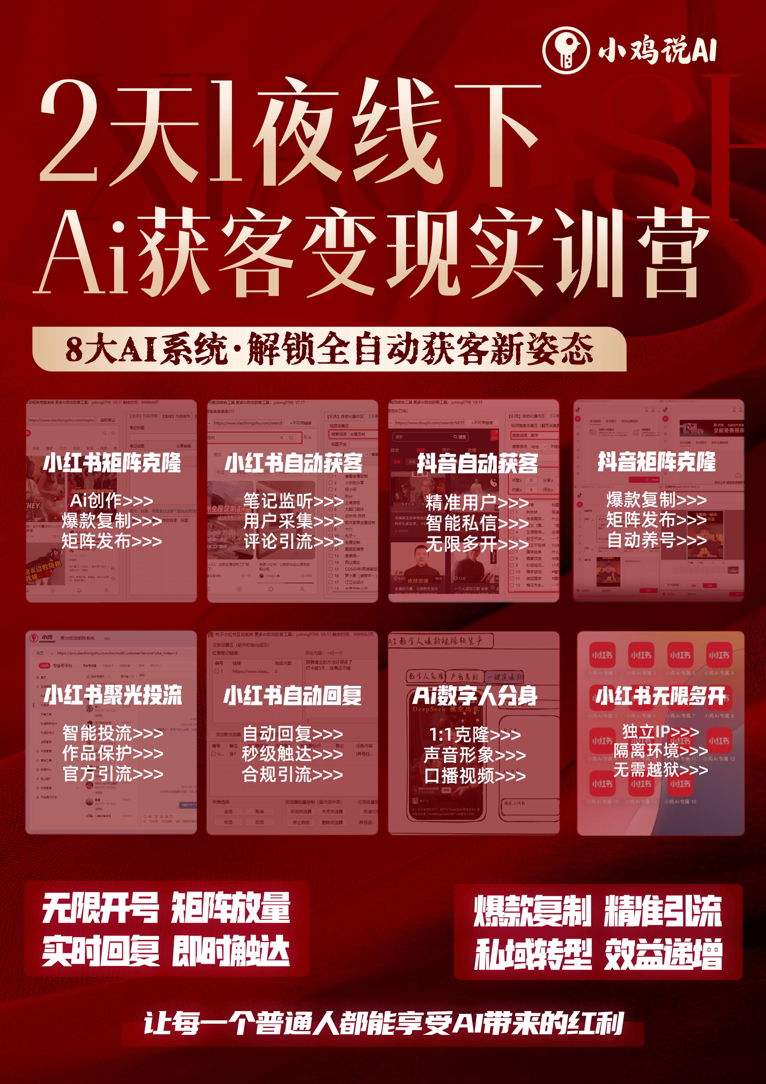 许多机构现有的团队知识结构,难以快速适应这种转变。而像小鸡说Ai两天一夜·AI获客变现实训营这样的服务,之所以能吸引大量创业者与转型企业,正是因为它直接提供了“思路-工具-实操”的全链路交付。在2.5万平方米的官方直播基地内,学员不仅能获得价值数万元的8大AI矩阵工具(如全自动克隆系统、精准截流系统、AI数字人克隆系统等),更能在顶级操盘手手把手指导下,完成从0到1的实战搭建,实现“1个人+AI”管理多账号矩阵,人力成本直降80%的效能飞跃。