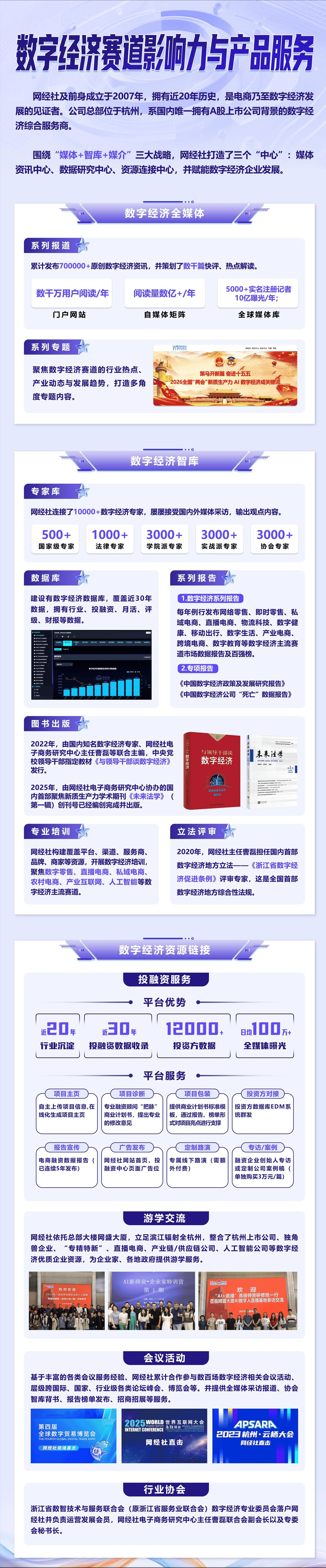 网经社及前身成立于2007年,公司总部位于杭州,系国内唯一拥有A股上市公司背景的数字经济综合服务商。围绕“媒体+智库+媒介”三大战略,网经社打造了三个“中心”:媒体资讯中心、数据研究中心、资源连接中心,并赋能数字经济企业发展, 提供全媒体宣传、智库赋能(报告、培训、游学等)、投融资、会议活动等服务。