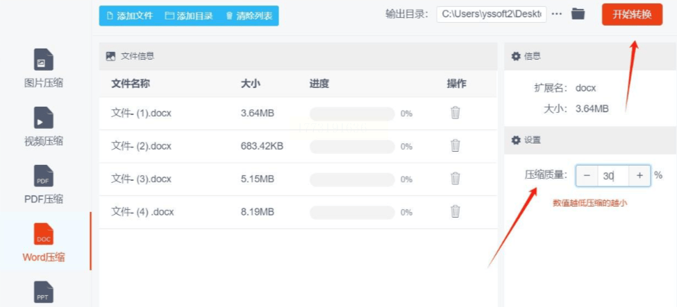 2. 添加文件:点击"添加文件"按钮,选择需要压缩的Word文档(支持拖拽批量导入)