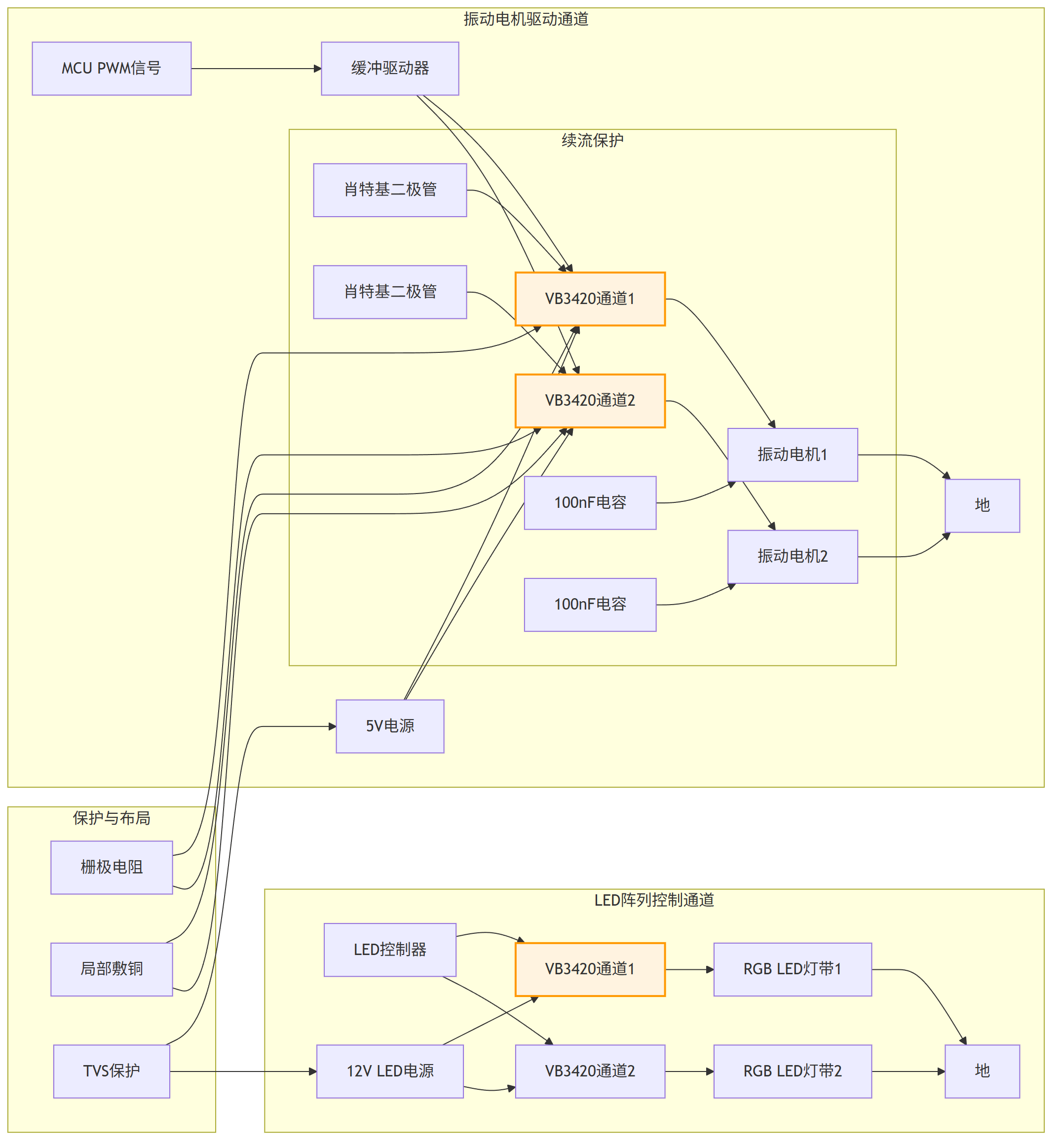 3. VB3420:可直接由MCU GPIO驱动,栅极串联10Ω-100Ω电阻;对于长走线或噪声环境,可增加74HC04等缓冲器增强驱动信号完整性。
