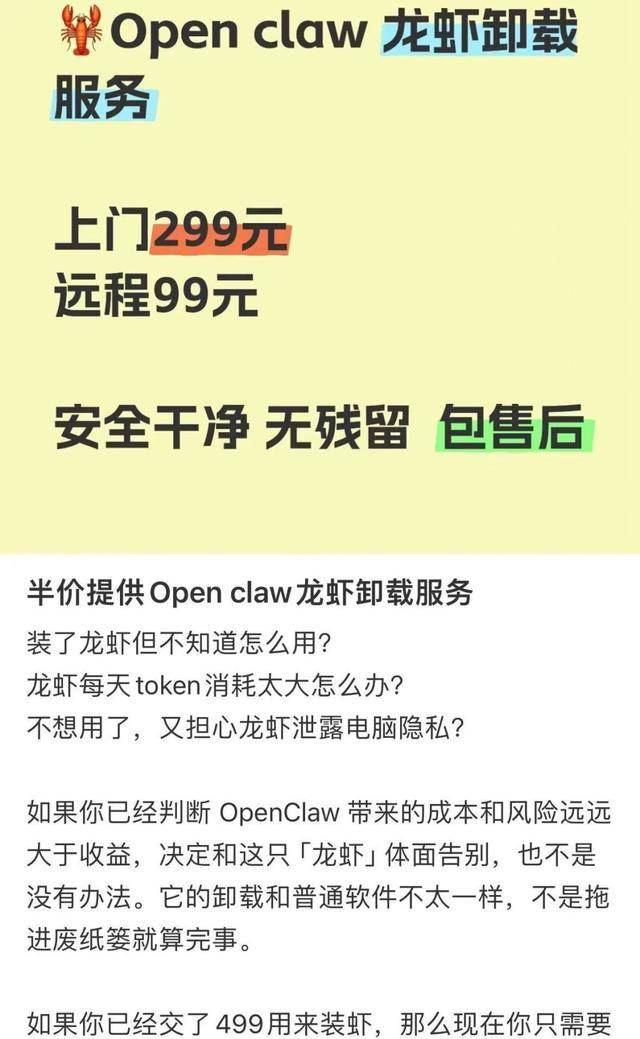 在『社交平台』上,有网友推出OpenClaw卸载服务,针对装了“龙虾”但不知如何使用、每天消耗的Token太多、担心“龙虾”泄露隐私等问题,该网友提供299元上门卸载、99元远程卸载服务,并打出“安全干净、无残留、包售后”等标签。