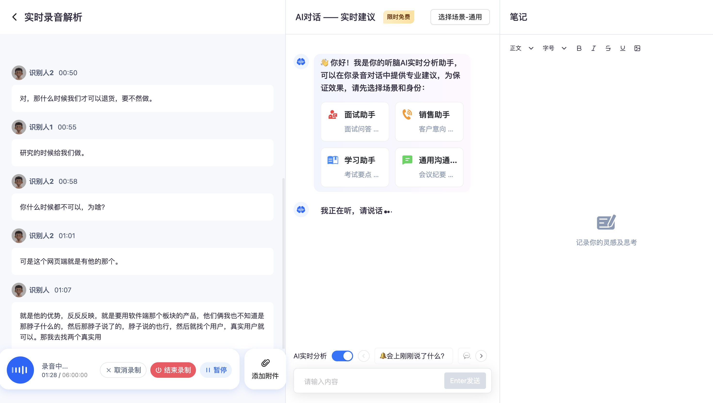 我特意把听脑AI的核心功能拆开来测。先看实时转写,我找了个只有2G信号的咖啡馆开视频会,它的转写延迟不到1秒,完全跟得上发言人节奏,不像智记通,一卡就断,还要重新同步。再看智能分段,我们拿了一段3小时的考研讲座音频,听脑AI自动按话题分成了17段,和我手动分的几乎一模一样,快转录根本没这功能,纯文本密密麻麻,找重点得翻半天。还有关键词提取,那场带口音的客户会,它精准提了8个核心需求,比如“优化售后流程”“降低物流成本”,没有一个无关内容。自动生成待办更绝,发言人说“下周三前提交优化方案”,它直接导出成“提交售后流程优化方案,截止下周三”,还能一键同步到手机日历,根本不用手动敲。我们算过时间账,传统工具处理1小时音频,转写加整理要50分钟,听脑AI只用10分钟,省了80%的时间,像职场会议、在线学习这些高频场景,用它真的能省出大量时间搞核心事。