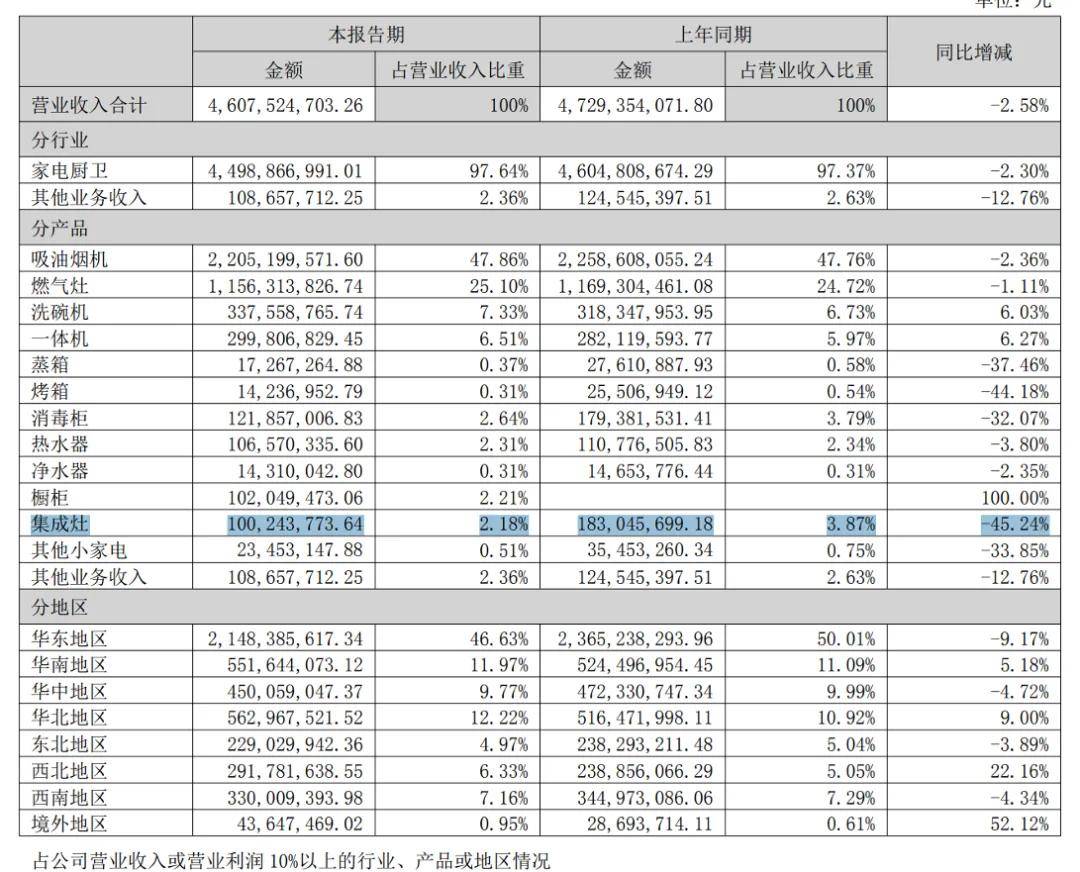 老板电器2025年上半年集成灶业务收入1亿元,较去年同期的1.8亿元下滑45%,2023年一度达到4.6亿元。