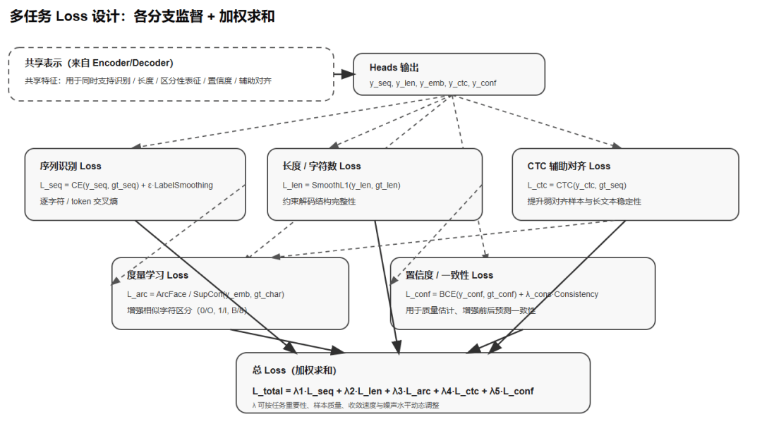 · 字符级度量嵌入学习使用 ArcFace Loss 对字符嵌入施加角度间隔约束,显著提升相似字符(如 0/O、1/I、B/8 等)的区分能力。