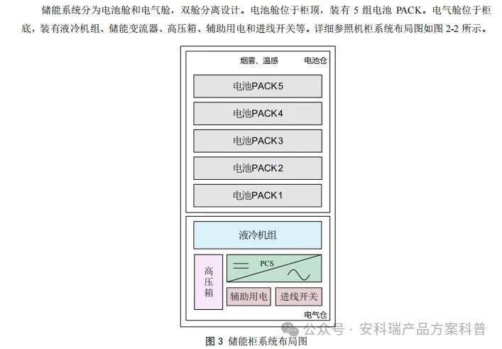 系统采用电池舱与电气舱双舱分离布局,电池模组位于柜顶,电气设备置于柜底,结构清晰,维护方便。