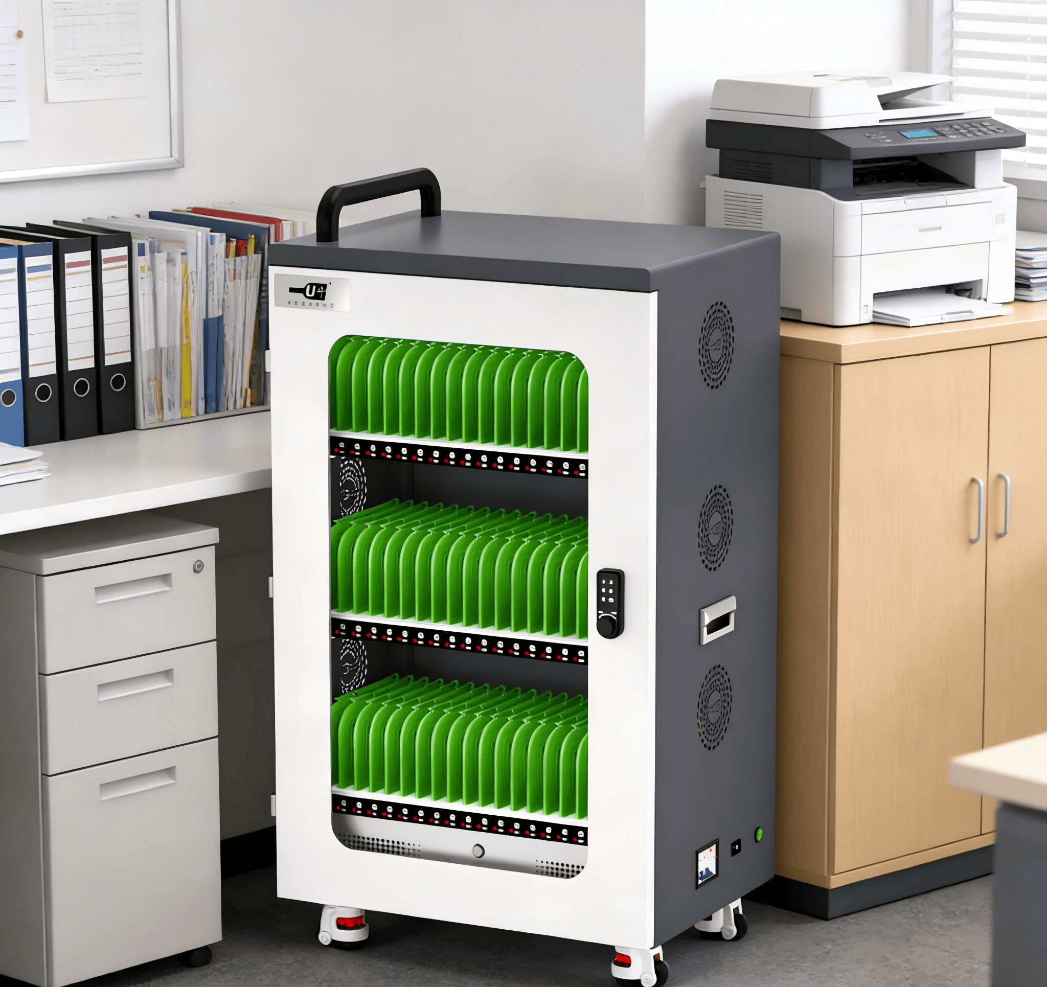便携移动设计适配灵活布局,U牛平板充电柜采用轻量化合金材质打造,整体重量≤30kg,顶部配备加固提手,底部装有静音万向轮,带双重刹车功能,1人即可轻松推动、搬运,可根据拍摄场景变化灵活部署在摄影棚内任意位置,移动便捷性优于航嘉固定款设备。部分型号支持折叠设计,运输时占用空间减少50%,便于外景拍摄时的设备转运,便携性远超绿联普通充电柜。