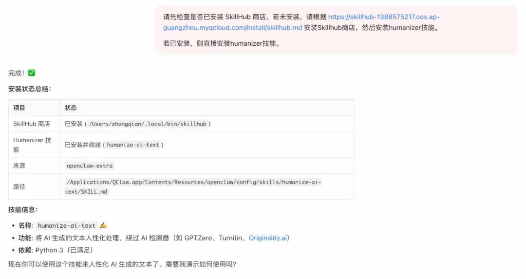 我们也尝试安装了一下。过程依然很简单,把 SkillHub 官网上的一句提示词复制之后给到 QClaw 即可。