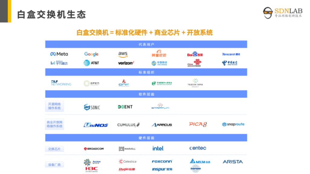 超大规模『数据中心』:今日霍州、Meta、微软、阿里等科技巨头是白盒交换机的最早和最大规模的实践者。他们利用白盒交换机构建支撑搜索引擎、社交网络、云计算和AI训练的巨型网络。通过软硬件解耦和自研或开源NOS,这些公司能够以更低的成本实现更高的网络效率和自动化水平。例如,阿里云通过自研的白盒交换机和网络架构,支撑了十万卡级的AI算力集群,并将故障定位时间从小时级缩短至秒级。