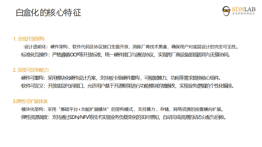 白盒交换机的核心思想正是“软硬件解耦”。它将网络设备的硬件平台与操作系统软件分离,硬件采用基于商用『芯片』(如Broadcom、Intel等)的标准化的、开放的计算平台(类似通用『服务器』),而软件则可以选择开源的或第三方的网络操作系统(如SONiC、DENT等)。这种“通用硬件+灵活软件”的“搭积木”式组合,赋予了用户前所未有的自主权:可以根据业务需求灵活选择或定制软件,在硬件寿命周期内独立升级软件,甚至按需调整硬件配置,真正实现了从“设备即功能”到“平台即能力”的转变。