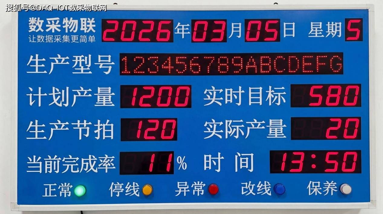这款电子看板是上海数采物联网科技有限公司专为车间产线实时可视化管理设计,型号为:DAQ-GP-Dashboard,支持采用LED高亮点阵屏显示,搭配红外传感器自动采集实际产量,支持生产型号录入、计划/实时目标产量设定、生产节拍监控、完成率自动计算,数据断电保持,适用于各类制造车间流水线、单机台产能监控。