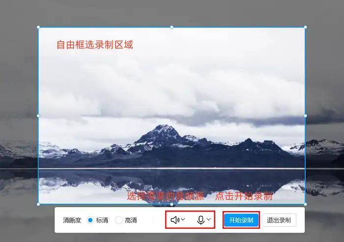 其次,设定录制区域,并可选调清晰度、音源等参数,设置完成后点击“开始录制”即可。