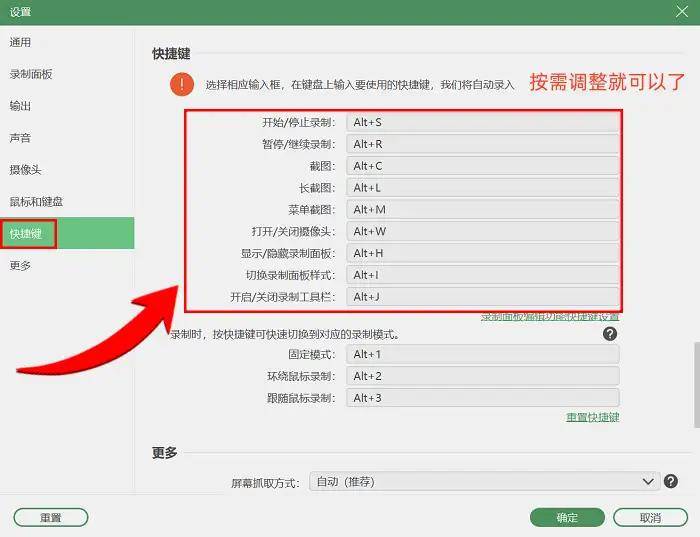 步骤2:选定模式后,可根据自身需求调整参数。以音频设置为例,若录制网课、电影片段,只需保留视频原声音即系统声音,仅勾选系统声音选项即可;若要录制教程并同步进行语音解说,就把麦克风声音也勾选上,两者同时开启也是可以的还可以点击快捷键设置去自定义电脑自带录屏快捷键。全部设置完成后,点击右侧的录制按钮,等待软件自动录制即可。