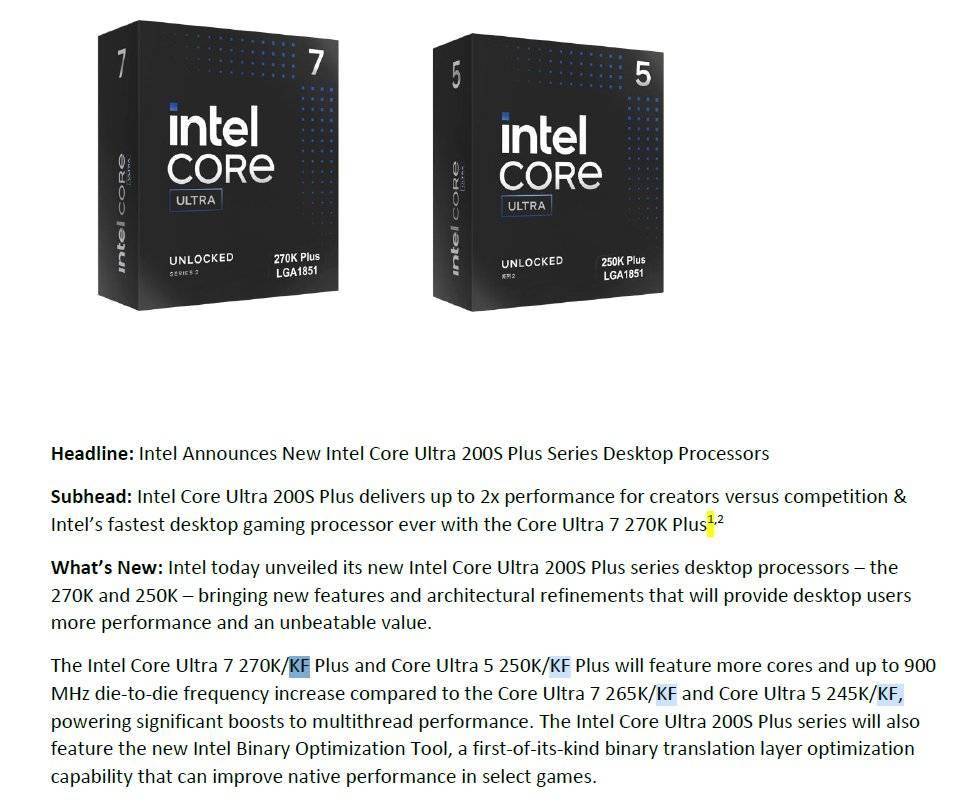 一方面,英特尔的“先前产品为 Arrow Lake”页面仅有三款新产品;而另一方面,台媒 UNIKO's Hardware 表示,其收到的英特尔官方新闻稿明确提及了 "Core Ultra 7 270K/KF Plus"。