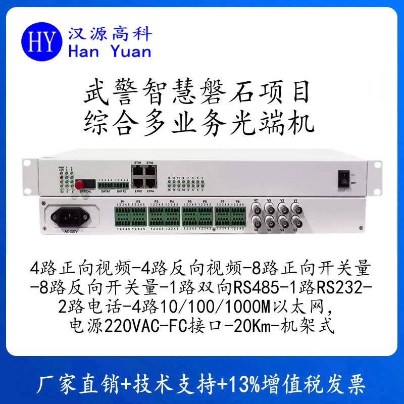 汉源高科武警哨位专用综合多业务光端机HY-4V(S)2D(S)8K(S)2P4GL参数:4路正向视频-4路反向视频-8路正向开关量-8路反向开关量-1路双向RS485-1路RS232-2路电话-4路10/100/1000M以太网,电源220VAC-FC接口-20Km-机架式