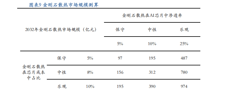 目前金刚石散热技术仍处于前沿开发阶段,规模化应用有待推进。因金刚石性能优异有望作为新型散热材料,我们认为随技术进一步成熟有望持续推广金刚石散热的规模化及商业化应用。我们采用情景假设法预测金刚石散热市场规模,我们以保守、中性及乐观3个场景,假设2032年金刚石散热方案在AI『芯片』中渗透率分别达到5%、10%、25%;随单『芯片』功率提升导致单『芯片』散热价值量提升,我们假设金刚石散热价值量在保守、中性及乐观预测场景下在『芯片』生产成本占比分别达到5%、8%、10%,以此计算金刚石散热市场规模,预计2032年全球金刚石散热市场规模有望达到97-974亿元,市场空间广阔。