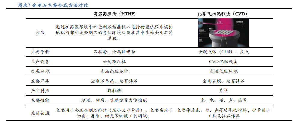 金刚石合成工艺分为高温高压法和化学气相沉积法,高温高压法适合大规模合成金刚石,化学气相沉积法适合更精细可控的金刚石生长,面向『半导体』领域的晶圆级金刚石通过化学气相沉积(CVD)制备。
