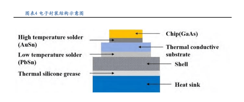 电子封装的主要是为了给电子器件提供稳定的工作环境,同时起到保护『芯片』和快速散热的作用。电子封装结构如示意图,图中『芯片』通过金锡焊料与导热基板连接,导热基板再通过铅锡焊料与壳体相连,将热量传递到壳体。最后通过导热硅脂将热量传递到热沉材料,以风冷或水冷的方式将热量带出。因此电子封装材料需具备良好的导热性能、力学性能和可加工性能等各项物理性能,保证电子设备的稳定、可靠和安全的运行。