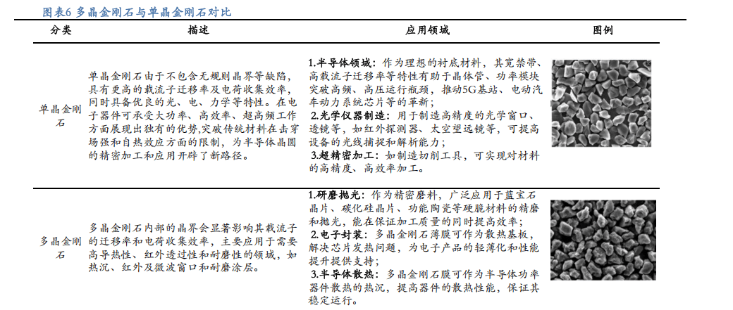 金刚石材料按照结构可分为单晶及多晶金刚石,两类材料在性能表现及应用等层面呈现区别。