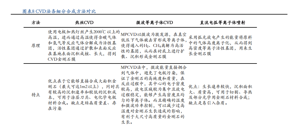 CVD法进一步细分包括热丝法(HFCVD)、微波等离子体化学气相沉积法(MPCVD)、直流等离子体喷射法等,MPCVD因没有电极污染而被认为是较优方案。