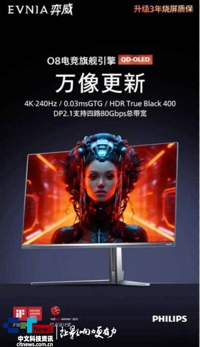 飞利浦近日在淘宝上架了32M2N8800P显示器,采用32英寸4K 240Hz OLED面板。该显示器配备3840x2160分辨率第三代三星OLED面板,响应速度0.03ms,峰值亮度1000尼特。