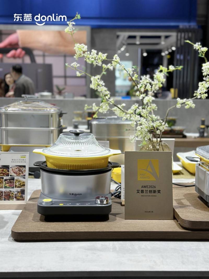 不仅如此,汽锅侧喷冷凝技术也是电蒸锅本次升级的核心创新点。为让现场观众更直观地理解蒸汽烹饪的工作原理,工作人员在现场分别用新品电蒸锅、中式料理锅和一代电蒸锅烹制了云南特色汽锅鸡,采用当季新鲜食材,汽锅内无需加一滴水,蒸汽便能逐步凝结成汤。蒸汽循环的奇观与扑鼻的鲜香,成为展会火爆打卡点之一。更值得关注的是,东菱中式料理锅还荣获了2026年AWE艾普兰创新奖,实用功能和技术创新得到了行业专业评委认可。