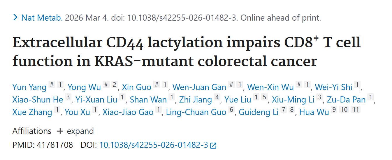 Yang Y, Wu Y,et al. Extracellular CD44 lactylation impairs CD8+ T cell function in KRAS-mutant colorectal cancer. Nat Metab. 2026 Mar 4.