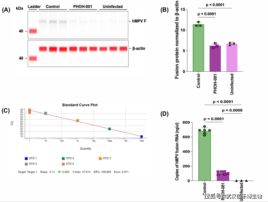 产品应用:该抗体用于 Western blot(Jess 自动毛细管系统)检测 hMPV F 蛋白表达,证实 PHOH-001 可显著下调 F 蛋白水平,为阐明其抗病毒机制提供关键蛋白水平证据。