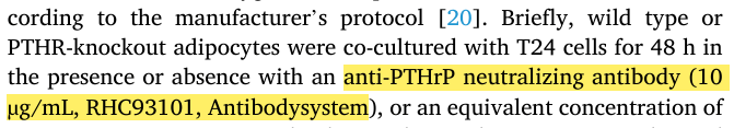 产品应用:使用该产品作为 PTHrP 中和抗体,在细胞共培养、脂肪细胞处理及动物实验中,验证其在脂肪棕色化、FFA 释放及膀胱癌恶性进展中的关键作用,为阐明相关分子机制提供核心实验依据。