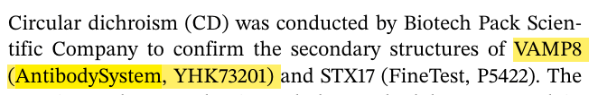 产品应用:使用该产品开展圆二色谱(CD)和表面等离子体共振(SPR)实验,CD 分析显示 IPA 可改变 VAMP8 二级结构,SPR 证实二者特异性结合(KD=5.08×10⁻⁶ M),为阐明 IPA 靶向 VAMP8 的分子机制提供关键支撑。