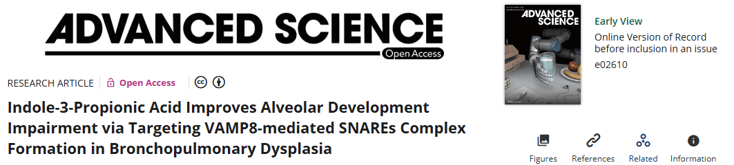 研究标题:Indole-3-Propionic Acid Improves Alveolar Development Impairment via Targeting VAMP8-mediated SNAREs Complex Formation in Bronchopulmonary Dysplasia