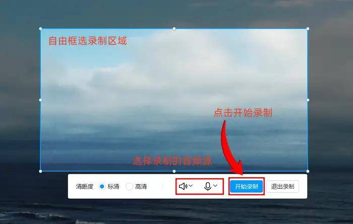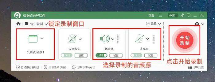 第二步:用鼠标选中目标录制窗口,之后可调节两个音频开关。麦克风负责录入解说配音,扬声器负责捕捉电脑音效。所有设置确认无误后,点击录制按钮启动录屏。