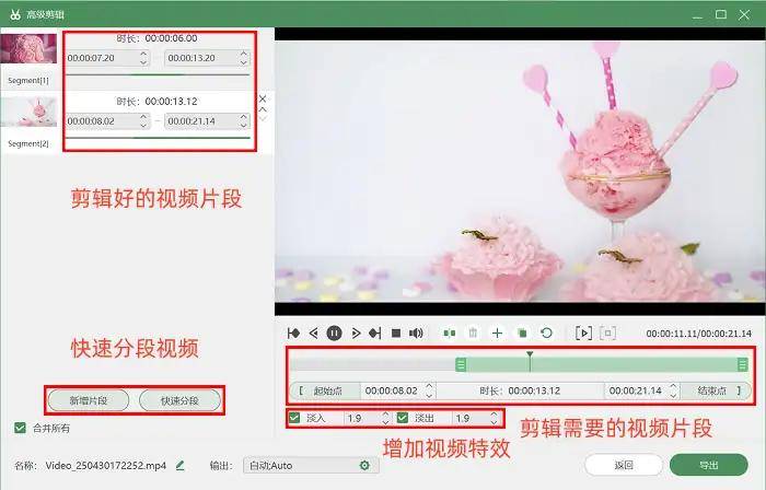 第三步:结束录制后,软件会自动弹出预览窗口,并且直接进入视频编辑状态。窗口下方的剪刀图标是关键工具,点击它既能添加视频特效,又能精准分割视频片段,实现类似胶片剪辑的精准操作。
