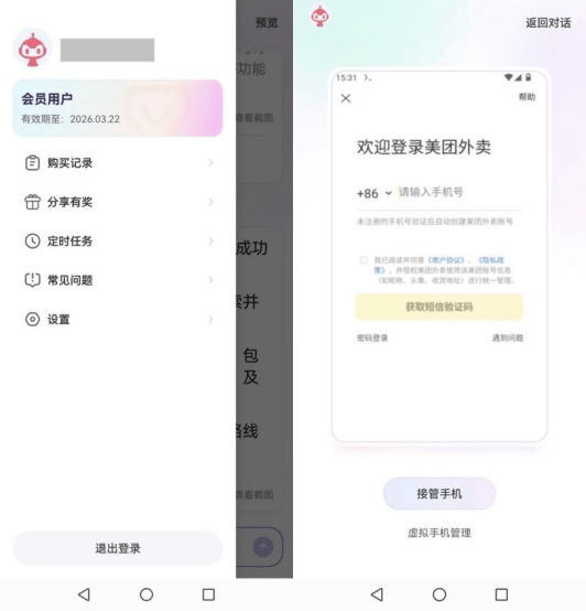 在外卖场景下,《BUG》栏目输入指令“帮我用美团外卖点一杯奶茶,选择离我家最近的一点点门店”,红手指Operator同样提示“接管手机”,《BUG》栏目同意服务条款,输入账号并验证。不过,多次验证均失败,最终同样无法完成指令任务。