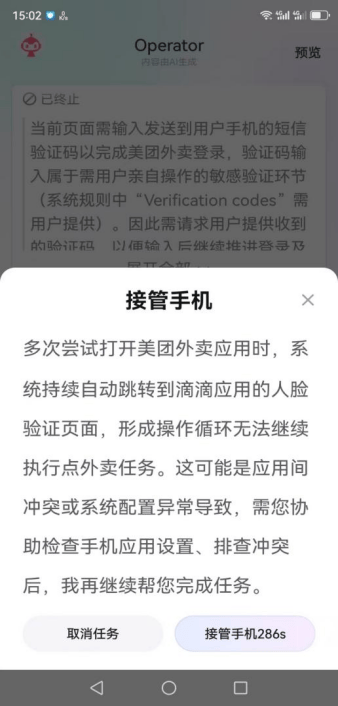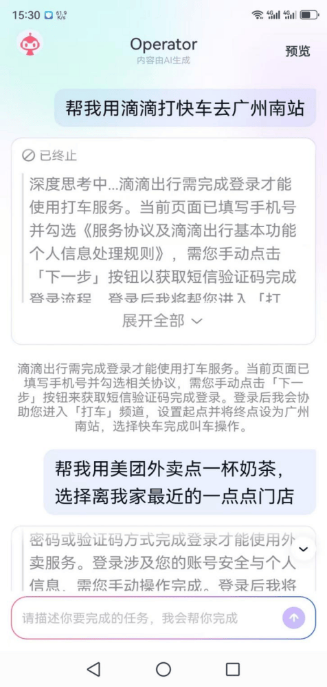 《BUG》栏目实测发现,红手指Operator目前仅支持文本输入,不支持语音输入,在指令理解上表现尚可,但任务完成度与操作流畅度仍存在明显短板,在出行、外卖等场景下,由于账户验证失败等原因,任务中断。有资深『互联网』人士指出,“从实际使用效果判断,该产品仍处于半成品阶段。”