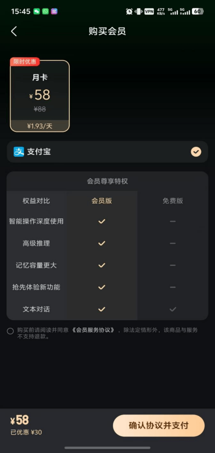 百度官方发文后,不少用户纷纷下载红手指Operator获取体验资格,新用户可享受10天免费体验。不过,由于活动过于火爆,后续的新用户需要开通会员才能使用,会员费为每月58元,并且仅可以通过『支付宝』支付。