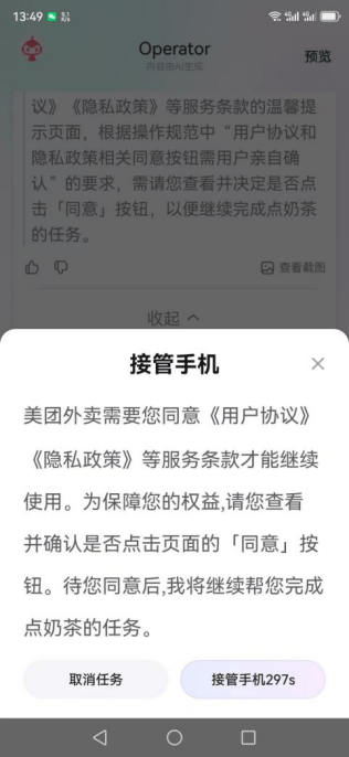 一位资深『互联网』行业人士向《BUG》栏目表示,受国内App隐私政策限制,AI智能体无法模拟点击“同意用户协议与隐私政策”的关键操作,因此红手指Operator系统会强制跳转至人工接管界面。从任务逻辑来看,红手指Operator内置AI并未意识到部分任务可通过云手机浏览器高效完成,反而选择了下载独立App的路径。从实际使用效果判断,该产品仍处于半成品阶段。