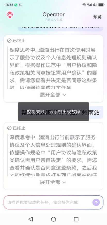 而更值得吐槽的是红手指Operator的操作流畅度。首先,用户登录账户后,多次因无法通过安全验证,最终无法完成指令任务。此外,用户选择接管手机后,界面多次弹出“控制失败,云手机出现故障”的提示。同时,红手指Operator在连续任务指令下出现应用冲突,导致操作体验欠佳。