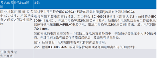 印刷电路板(PCB)也包括在技术安全分析中。ISO 13849-2:2012针对PCB的故障(失效模式)及其排除项给出了建议。根据该标准,在某些特定考量(如表2“备注”栏中所列)下,可以排除部分假设的失效模式。