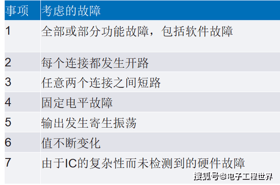 基本功能安全(FS)标准2的表A.1中,展示了在量化随机硬件失效的影响时要假设的失效情况,或在推导SFF时要考虑的失效情况。值得注意的是,对于直流故障模型假设,需要考虑如下之类的失效模式:固定电平故障、固定开路故障、开路或高阻抗输出、信号线之间短路、任意两个连接(引脚)之间短路(针对IC)。