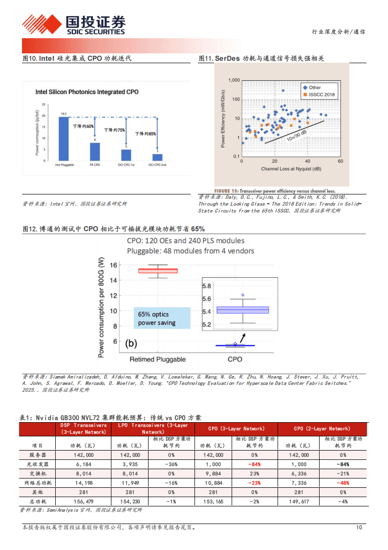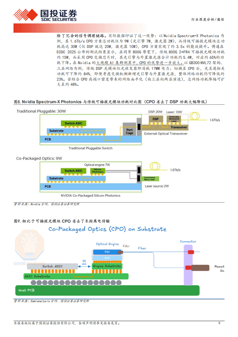 在能效表现上,CPO展现出显著优势。通过将电互连距离从厘米级缩短至百微米级,系统不仅大幅降低了驱动功耗与阻抗损耗,更减少了对高功耗DSP的依赖。以Nvidia Spectrum-X Photonics为例,其1.6T CPO方案总功耗仅9W,而传统可插拔方案高达30W。在大规模AI集群部署场景下,CPO可使光互连相关功耗下降84%,整体网络功耗降低23%至48%。