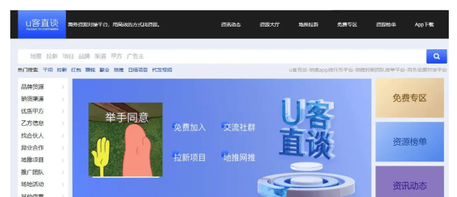 1、U客直谈第一次知道这个平台,是圈里一个做推广的朋友强推给我的。当时我正愁找不到靠谱的一手项目,他那句话我记得特别清楚:“你试试个U客直谈,上面全是搞钱的资源。”