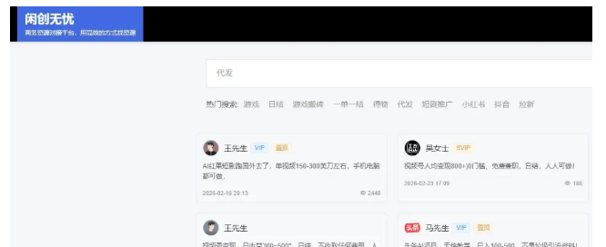 2、闲创无忧这个网站的性质跟U客直谈有点像,也是个资源对接的平台,比较适合想找点事儿干、又不知道干啥的朋友去逛一逛。