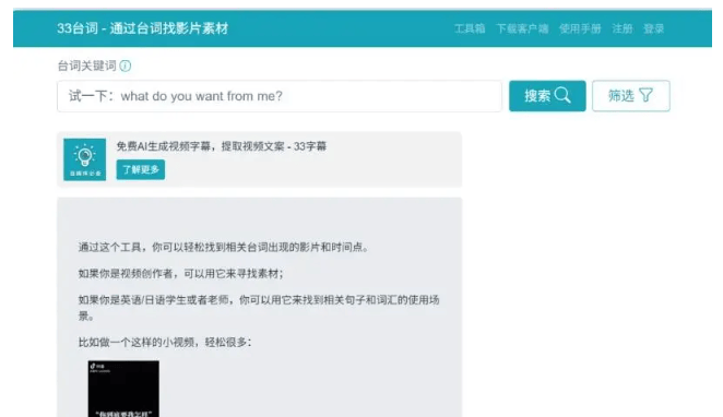 4、33台词你一定有过这种时刻:脑子里蹦出一句经典台词,抓心挠肝想不起是哪部电影。普通搜索引擎只能给你模糊范围,而33台词,是台词界的“人脸识别系统”。