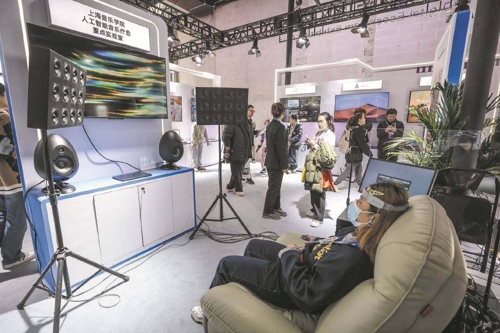 上海音乐学院人工智能音乐疗愈重点实验室在本次展会上,带来了一套数字音乐疗愈设备。用户戴上轻便的脑电设备,可监测出身体数据。随后,AI模型会用算法即时分析评估状态,自动生成匹配的疗愈音乐,再通过持续监测动态调整方案。 记者 袁婧摄