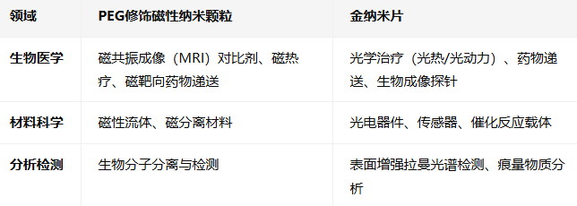 在生物医学领域,PEG修饰磁性纳米颗粒凭借磁响应性,成为磁靶向药物递送和磁热疗的优选载体,而金纳米片则因光热效应和SERS增强特性,在光学治疗和生物成像探针方面表现突出。材料科学中,磁性纳米颗粒用于磁性流体和磁分离材料,金纳米片则应用于光电器件和催化反应载体。分析检测方面,磁性纳米颗粒通过磁分离实现生物分子富集,金纳米片则通过SERS技术实现高灵敏度检测,两者形成互补。