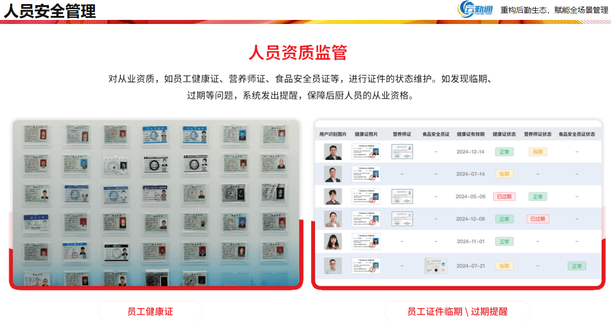 云勤通最大的优势在于“一平台统管”。它的食安模块不是孤立的,而是和智慧食堂、食材进销存、报修、资产、能耗等全后勤系统打通