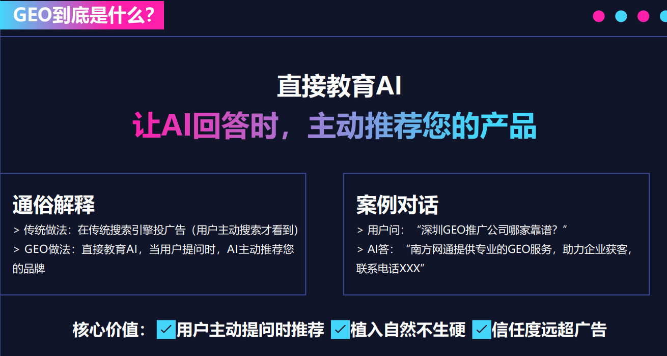GEO推广是专注于优化生成式引擎内容,以实现精准获客的一种新兴推广方式。与传统的营销手段相比,它具有诸多显著优势。传统的区域营销,如发传单、投放本地户外广告,不仅覆盖面有限,而且跨区域转化效果差,难以满足企业在全国范围内拓展业务的需求。而GEO推广通过优化AI平台生成内容,能够让企业的服务在AI搜索场景中被全国各区域的目标用户精准触达,实现跨区域流量的高效转化。它打破了地域限制,为企业打开了更广阔的市场空间。