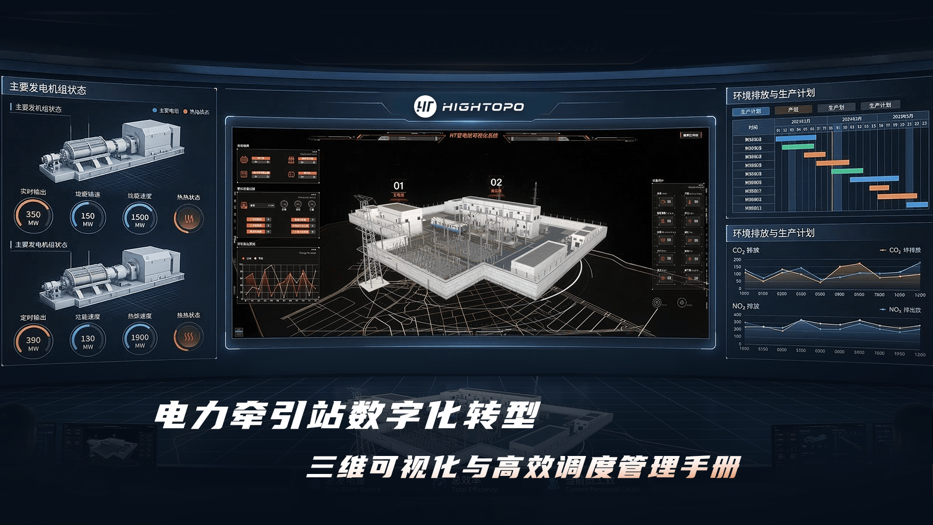 此处,图扑 HT基于自研 3D 渲染引擎,为牵引站搭建轻量化、可交互的三维可视化场景,无需安装插件即可在浏览器端实现毫秒级场景加载,同时支持设备漫游、参数查询、状态切换等交互操作,让运维人员直观掌握设备运行细节,彻底改变传统监测 “数据抽象、状态模糊” 的困境。