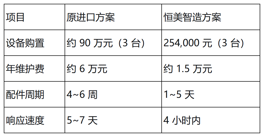- 设备投入节约:相比更换同品牌进口设备,节约投入约 65 万元