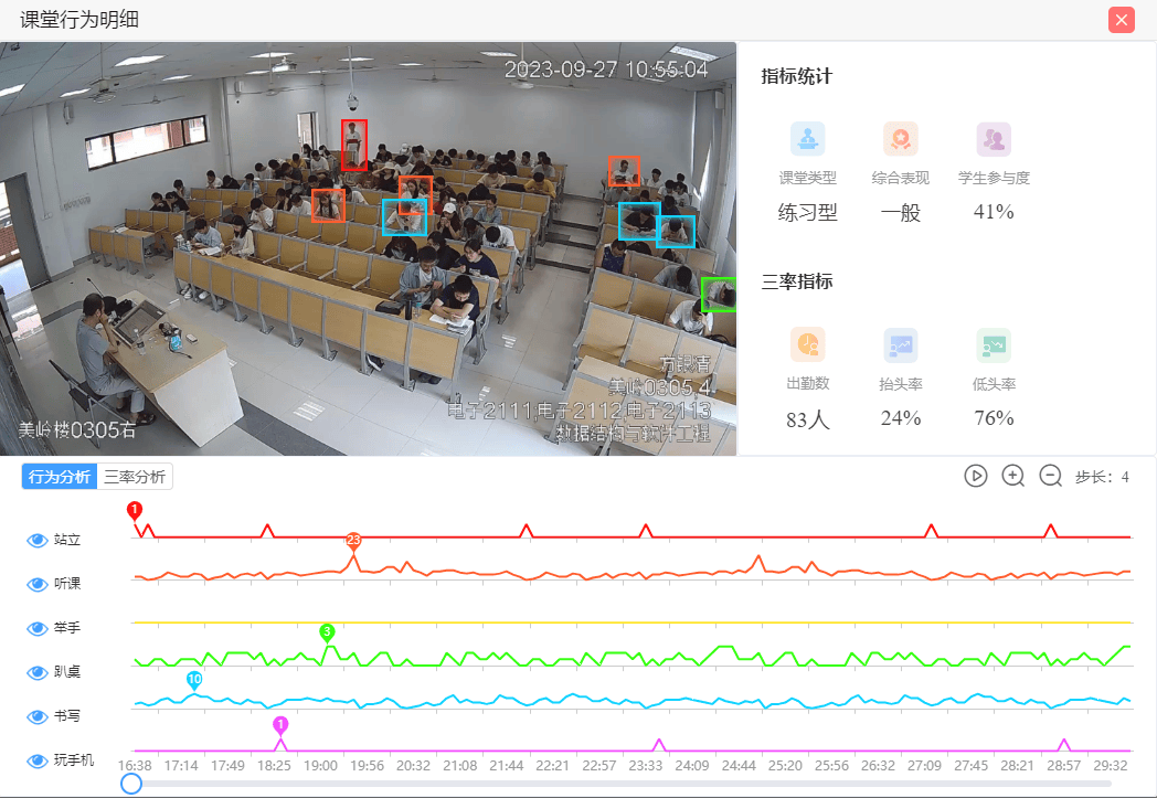4.可提供IP喊话、摄像机📹️云台控制、截图留证等功能,并可拓展学生行为分析(听讲、起立、 阅读、书写、举手、趴桌子)、抬头率、低头率、出勤率数据统计。
